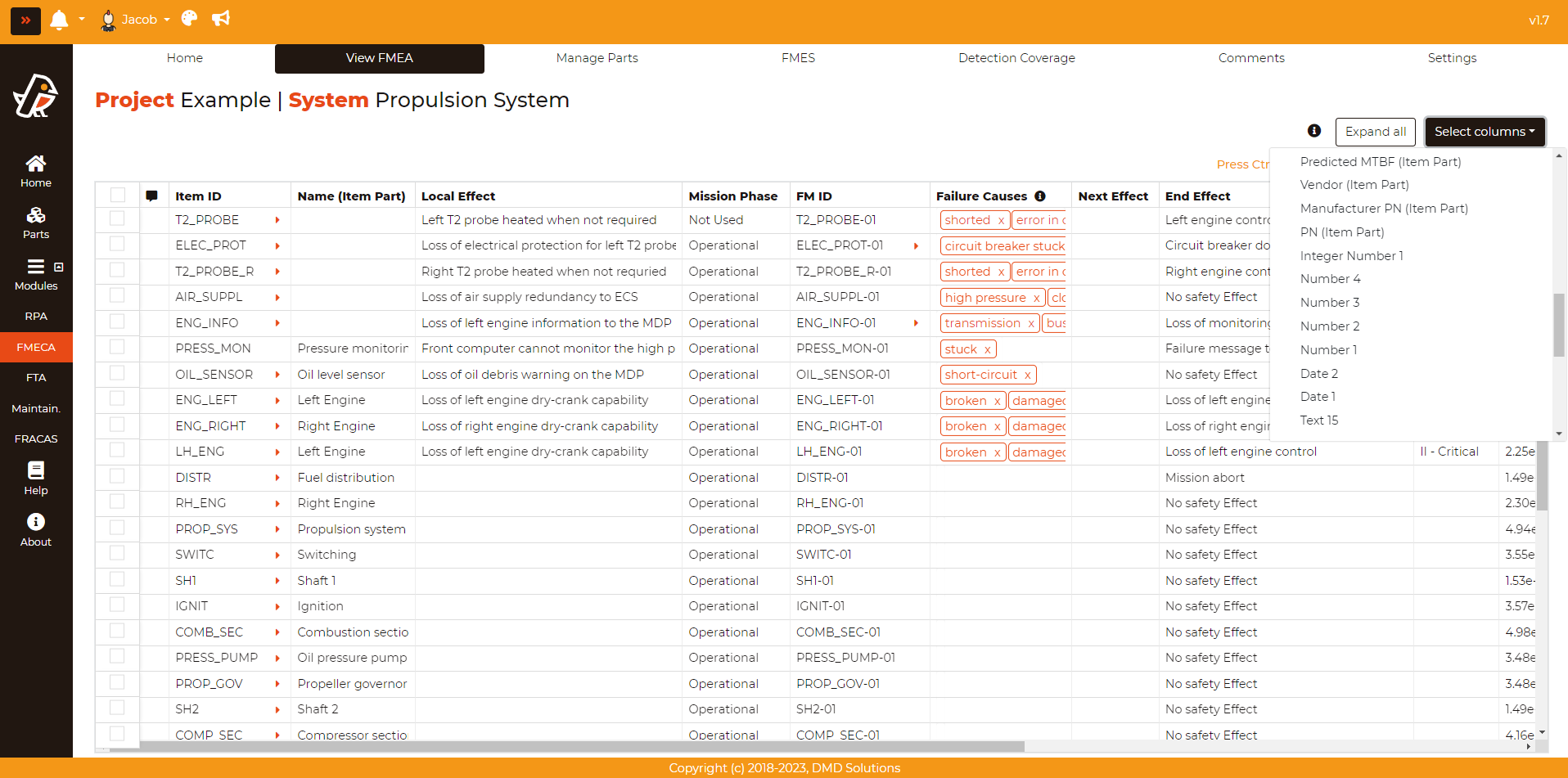 Columns can be renamed by right-clicking on the column header. Moreover, the column ordering can be changed by dragging the column header to the desired position. This action, as well as selecting the visible columns, can also be performed in the FMECA Settings page.