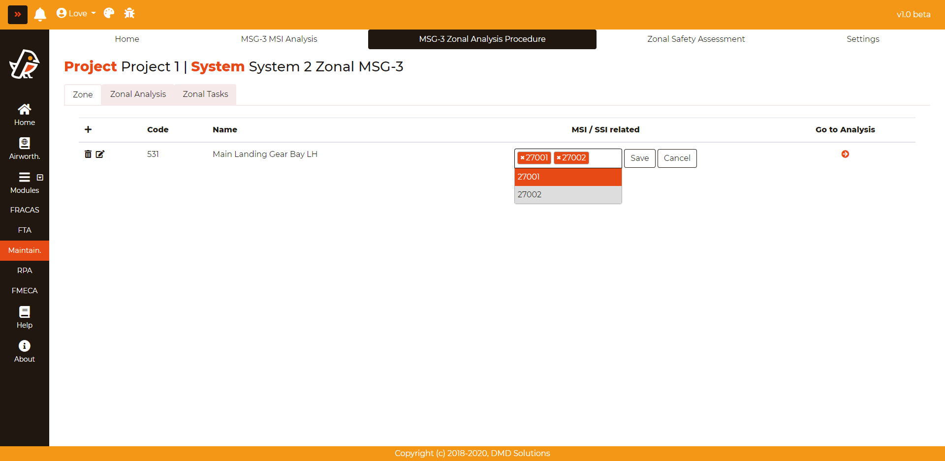To perform the zonal analysis, go to Maintainability > MSG-3 Zonal Analysis > Zonal Analysis. For each zone, four different analysis are required. After choosing a zone, the user will have to fill four different forms: