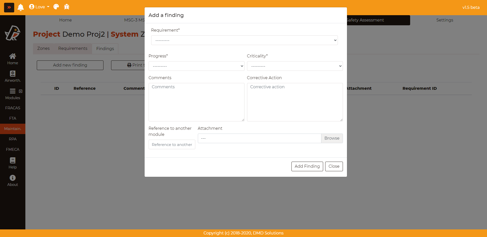 +in the ID Finding column. It will open the Findings form.Delete last finding: The user can delete the last finding created for each requirement. To do it, click on the minus button