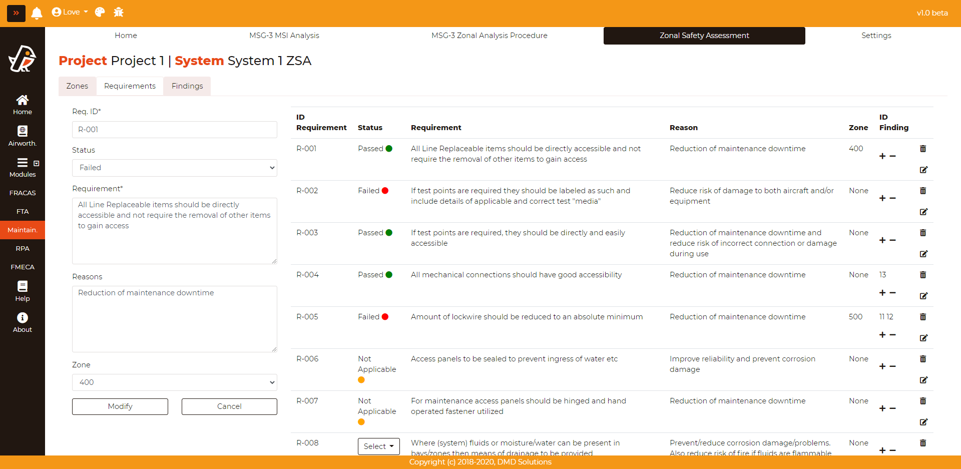 The aim of ZSA is to check if a zone meets safety standards. In order to check it, a list of requirements must be satisfied. All the requirements are listed in Maintainability > Zonal Safety Assessment > Requirements: