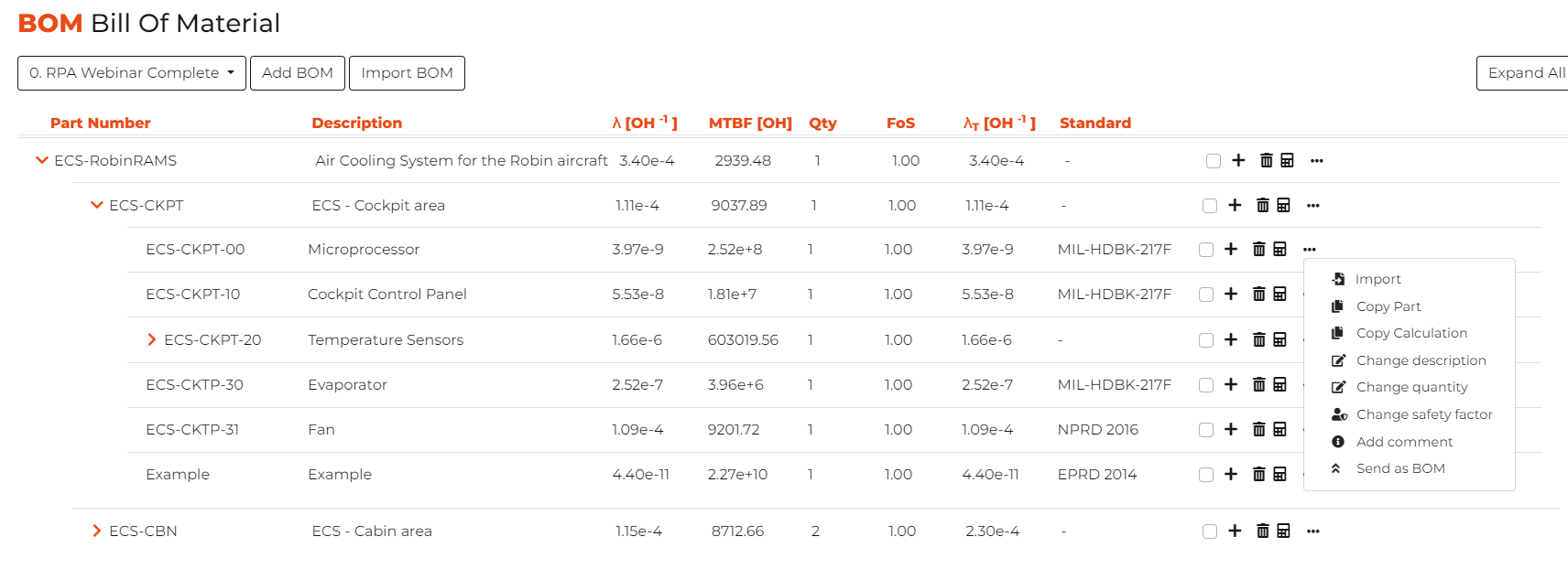 After computing the failure rate in the corresponding page, Robin gives the option to go back to the BOM. Note that, if the node has children, the computation is performed based on the failure rates of the children (see the RPA | Reliability Prediction Analysis section for computation details).